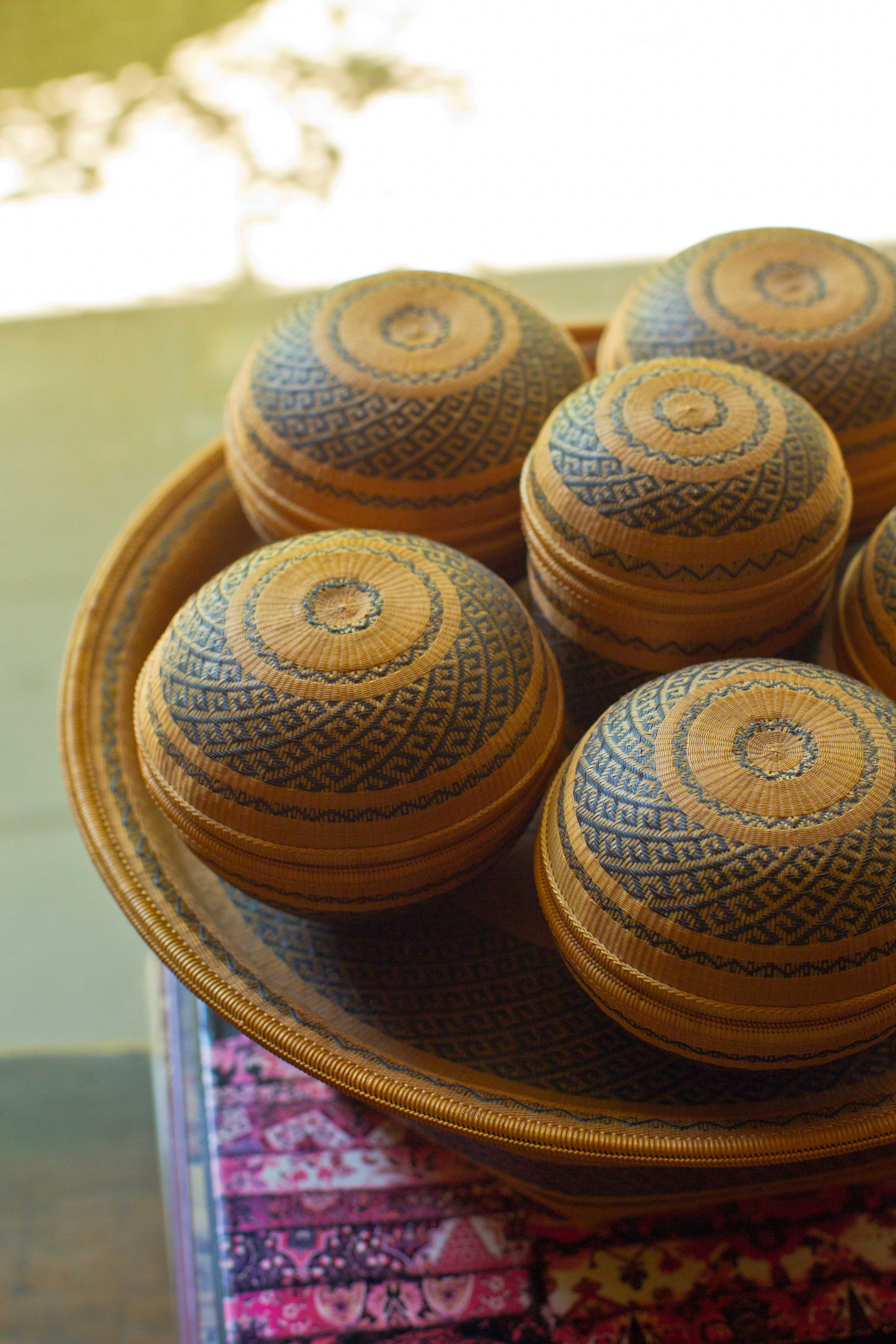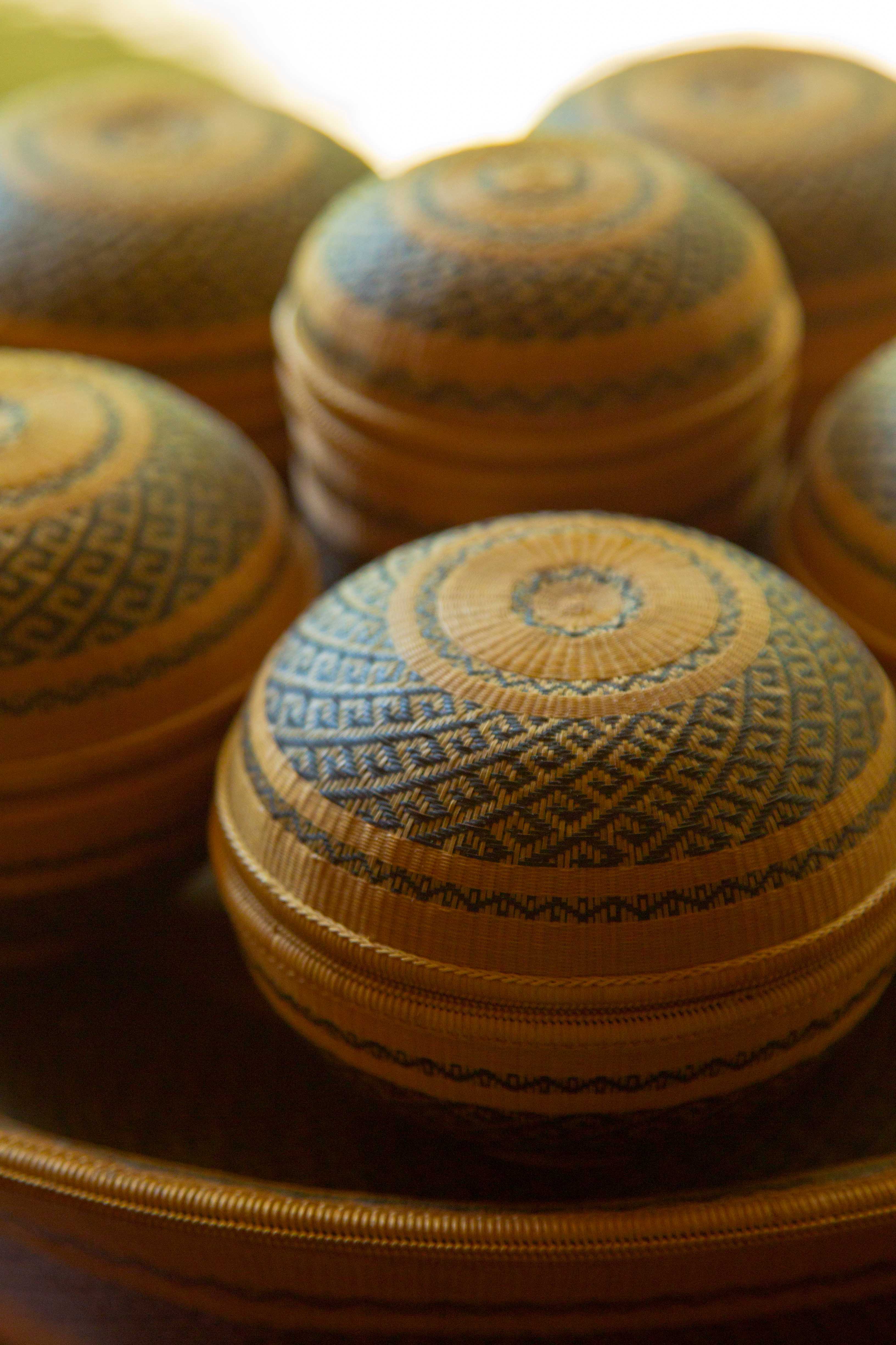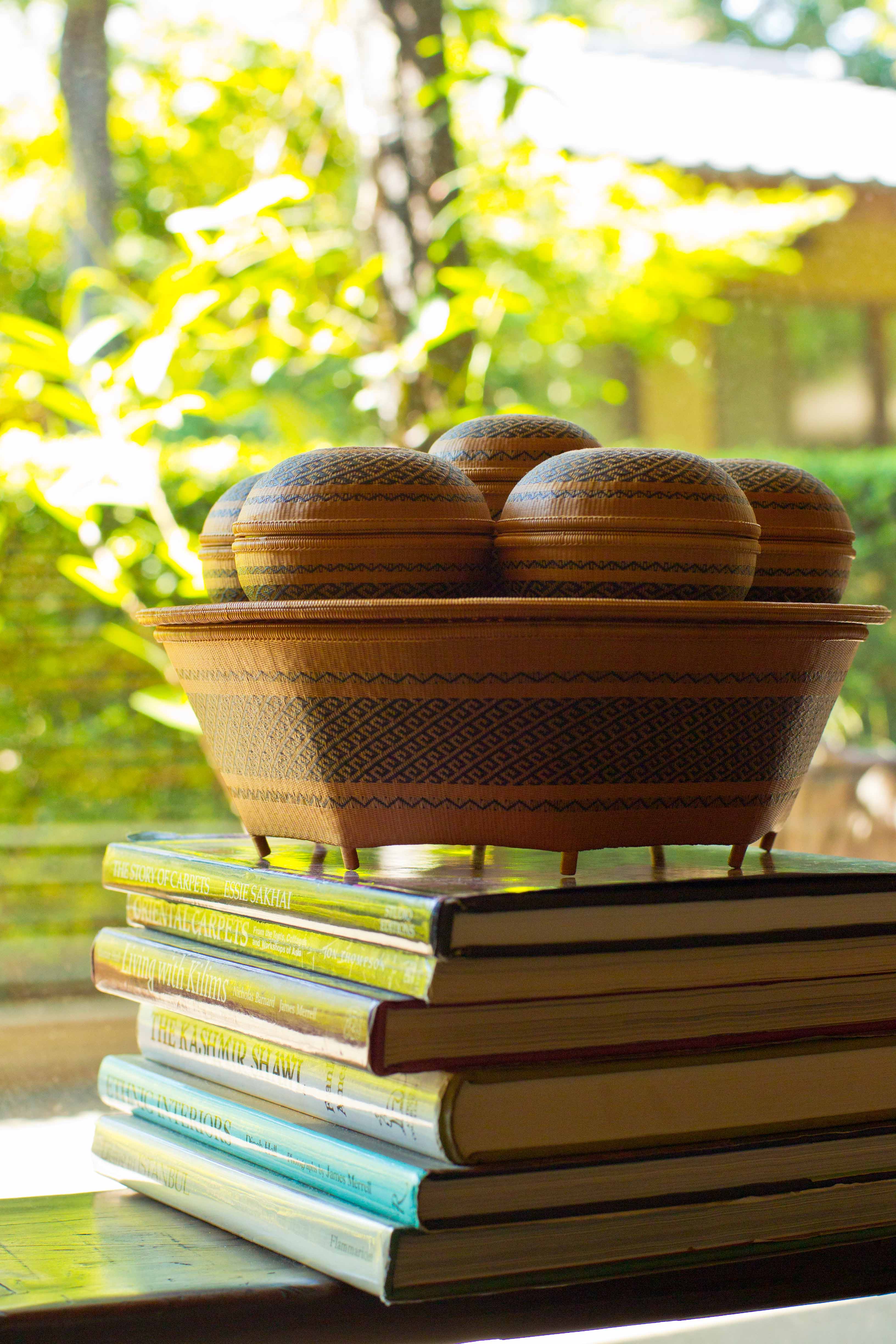 最近ではあまり見られなくなりましたが、アジアでは「檳榔(ビンロウ)」と呼ばれるヤシ科の植物の種子を、石灰の粉やクミンと一緒にキンマの葉で包み、噛みタバコのように噛んで嗜好する習慣があり、これら檳榔などを入れる収納用具をモチーフに、タイ南部の職人たちによって制作されたものです。竹を極細の糸のように割いて編んでいく工程は長い時間をかけて行われ、竹細工の技術としては世界的にも最高水準といわれています。